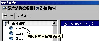 如下圖,在動作面板上 Go To 的位置(左鍵)雙擊,右方即會出現反白的「gotoAndPlay(1) 此指令會使電影由 29 影格直接跳回